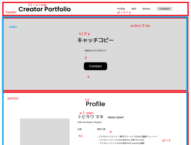 マークアップ準備 実際にデザインを見ながらマークアップするとき、慣れないうちはデザインを印刷するか、白い紙に手書きで「セクションに分ける」枠を書き込みます。 それぞれの要素に対して、どの種類のタグを付与するか、これも書き込みます。 慣れてき...