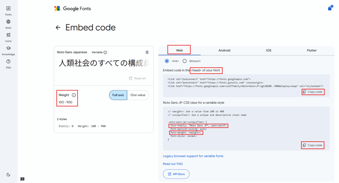 Noto Sans Japaneseの場合は、100から900まで、100単位で設定が可能です。