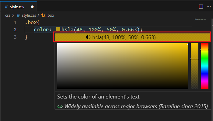 color: hsla(48, 100%, 50%, 0.663); /*彩度100% 照度50%*/