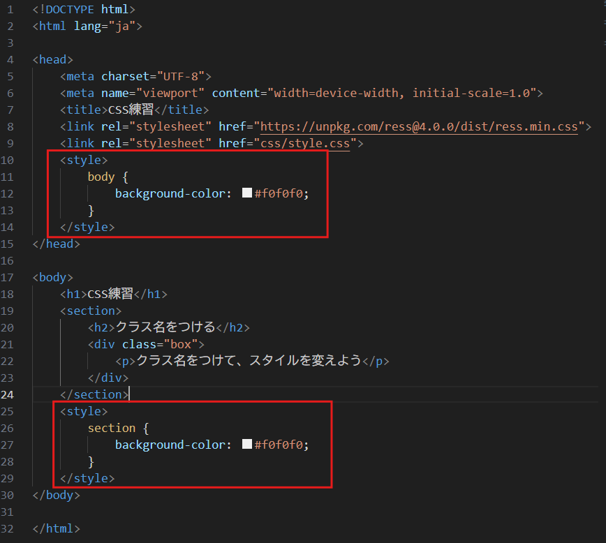 styleタグによりHTMLのheadまたはbodyの中に書く