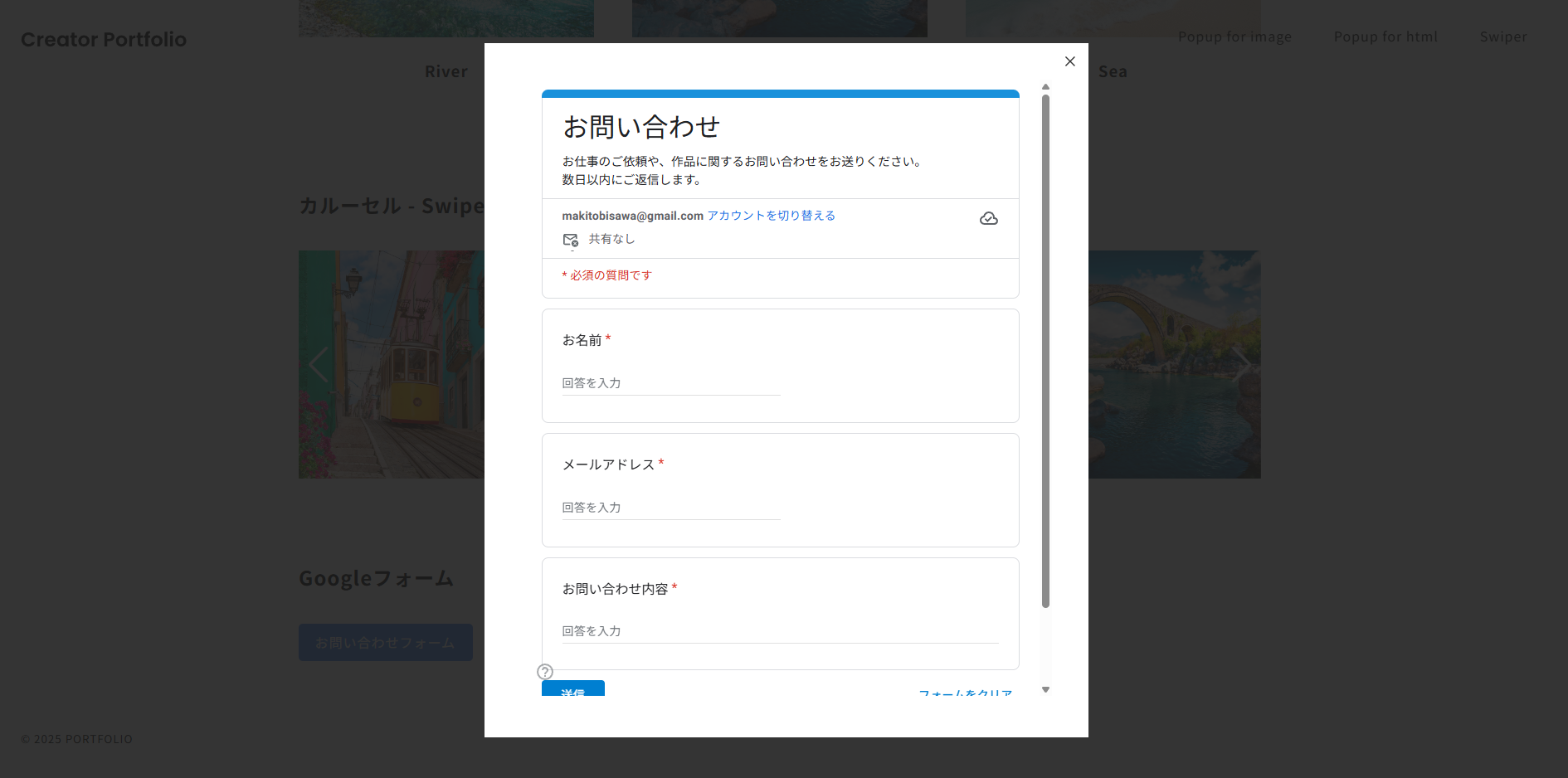 そこで、Googleフォームを作成し、ボタンをクリックしたらFancyboxでポップアップして表示するような動きを実装してみます。