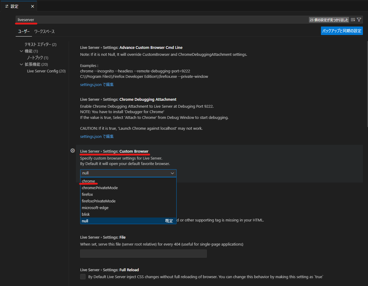 使用するブラウザは、設定で「liveserver」と検索し、「Custom Browser」の箇所で変更可能。(上記画像参照) - Japanese Language Pack for Visual Studio Code