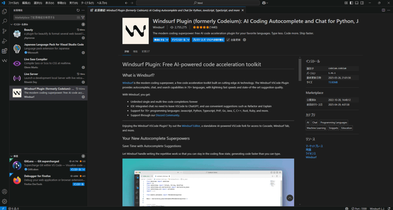 - Windsurf Plugin (formerly Codeium)—>別途アカウント登録+接続設定が必要