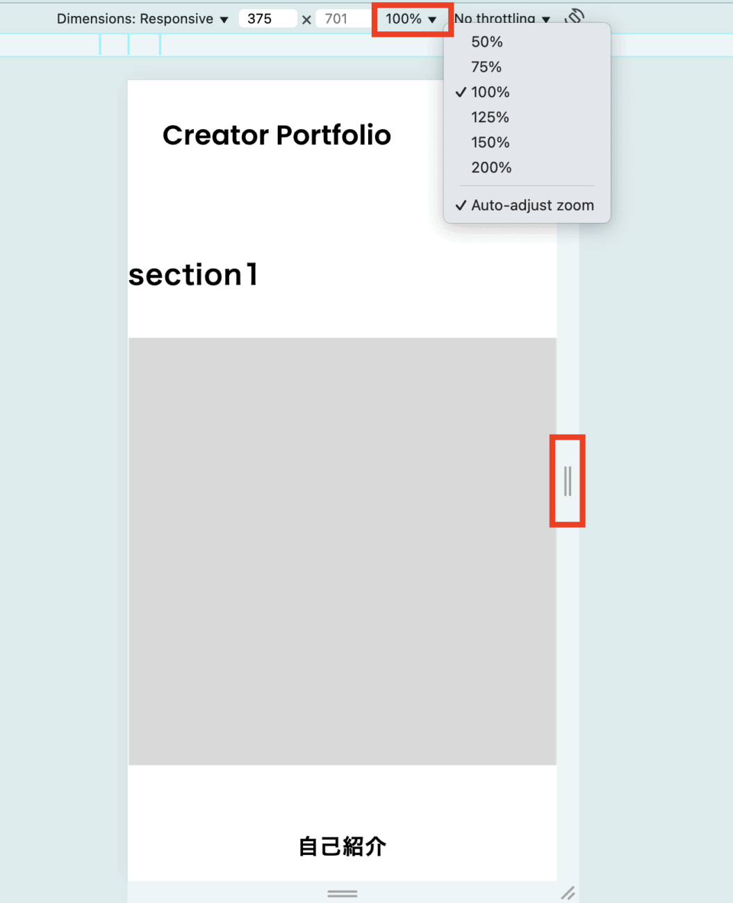 上部の100%と表示されている箇所は縮尺で、ここを小さくすると、疑似的に大きな画面での表示確認ができます。