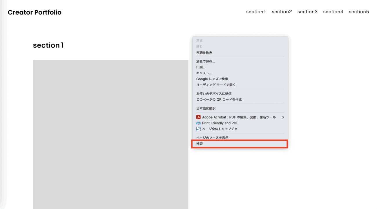 レスポンシブの実装時は、ブラウザでの表示確認をスムーズに行いたいので、chromeでの確認方法をいくつか紹介します。画面で右クリックして「検証」ウィンドウを開きます。