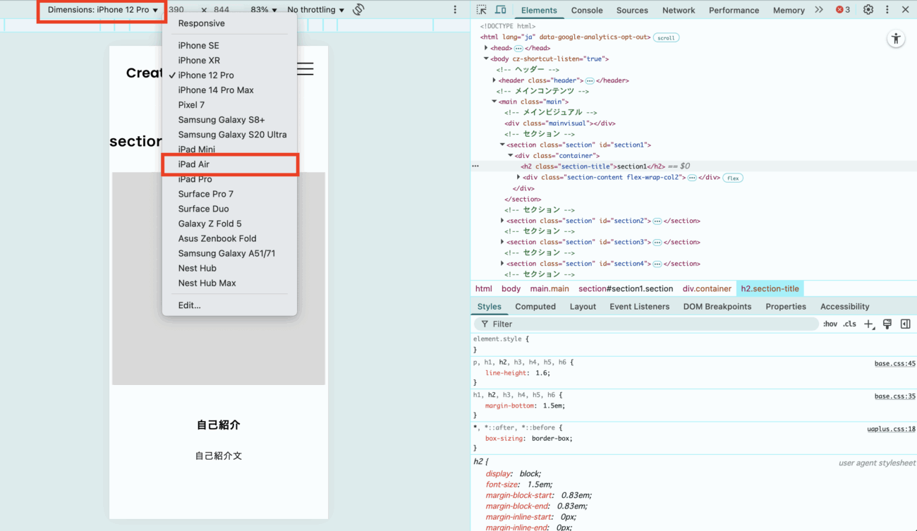 「Dimensions」プルダウンで、デバイスの種類を切り替えることができます。