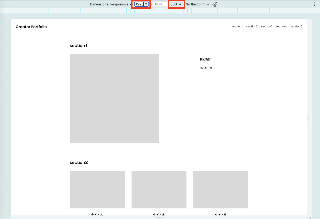 例えば、50%の状態にしてから幅を1920に変更すると、一番普及しているPCモニターの横幅での表示確認ができます。
