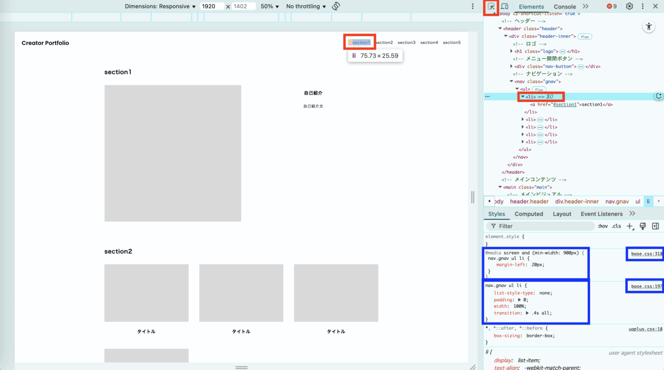 @media指定の設定がbase.cssの318行目にあり、2番目にはデフォルト設定が197行目にあります。