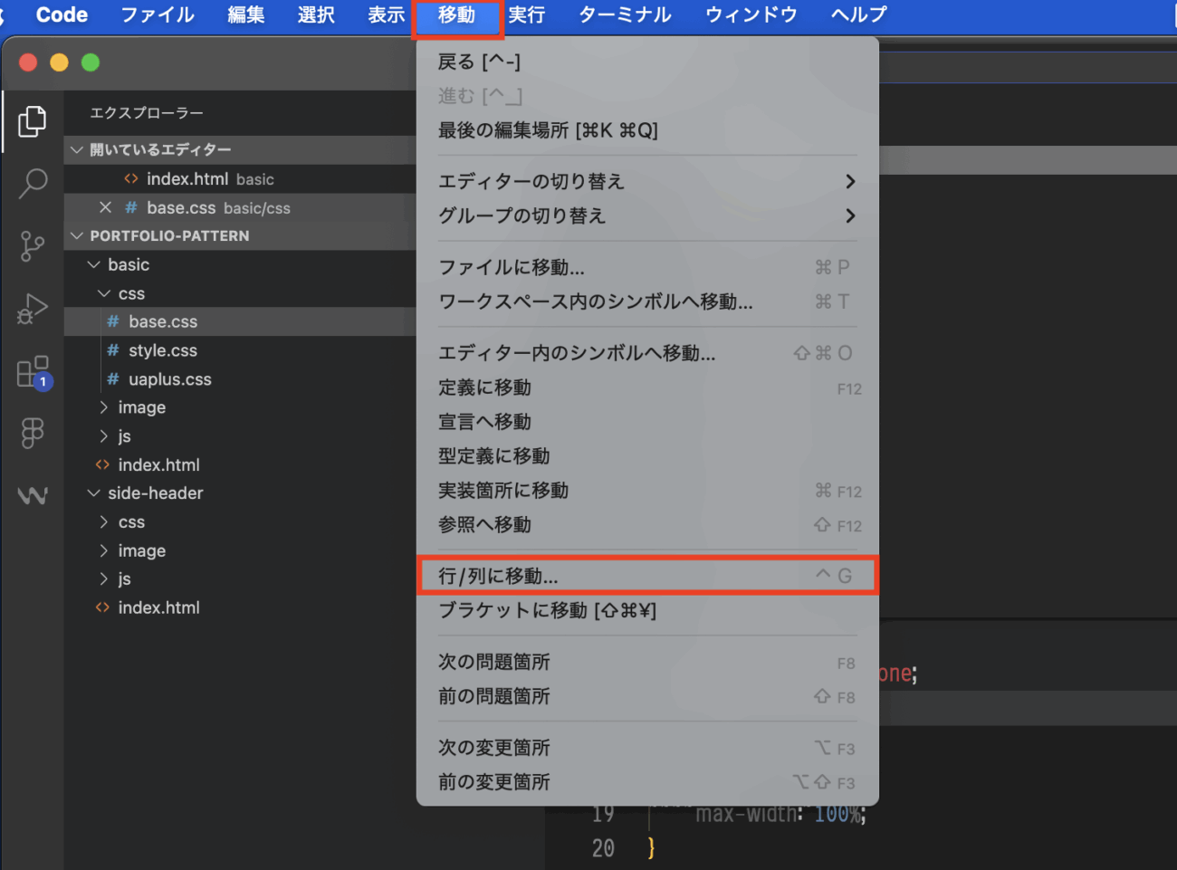 base.cssの318行目を編集するには、VS Codeの「移動 > 行/列に移動…」からジャンプします。