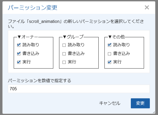 通常は、サーバー会社が設定したデフォルト値には意味があるので、よくわからない場合には、初期値のパーミッションを設定しておきましょう。安易に変更すると、セキュリティが甘くなってしまう恐れがあります。
