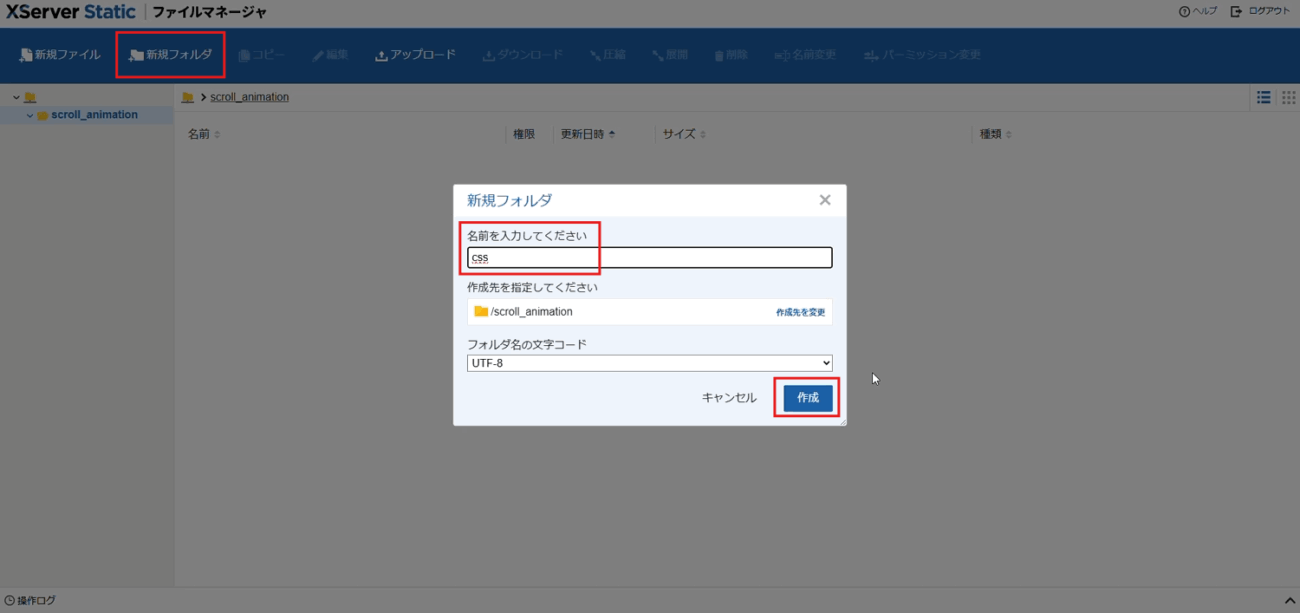 上部の「新規フォルダ」をクリックし、名前を半角英数字で入力し、作成先を確認の上「作成」をクリックしましょう。