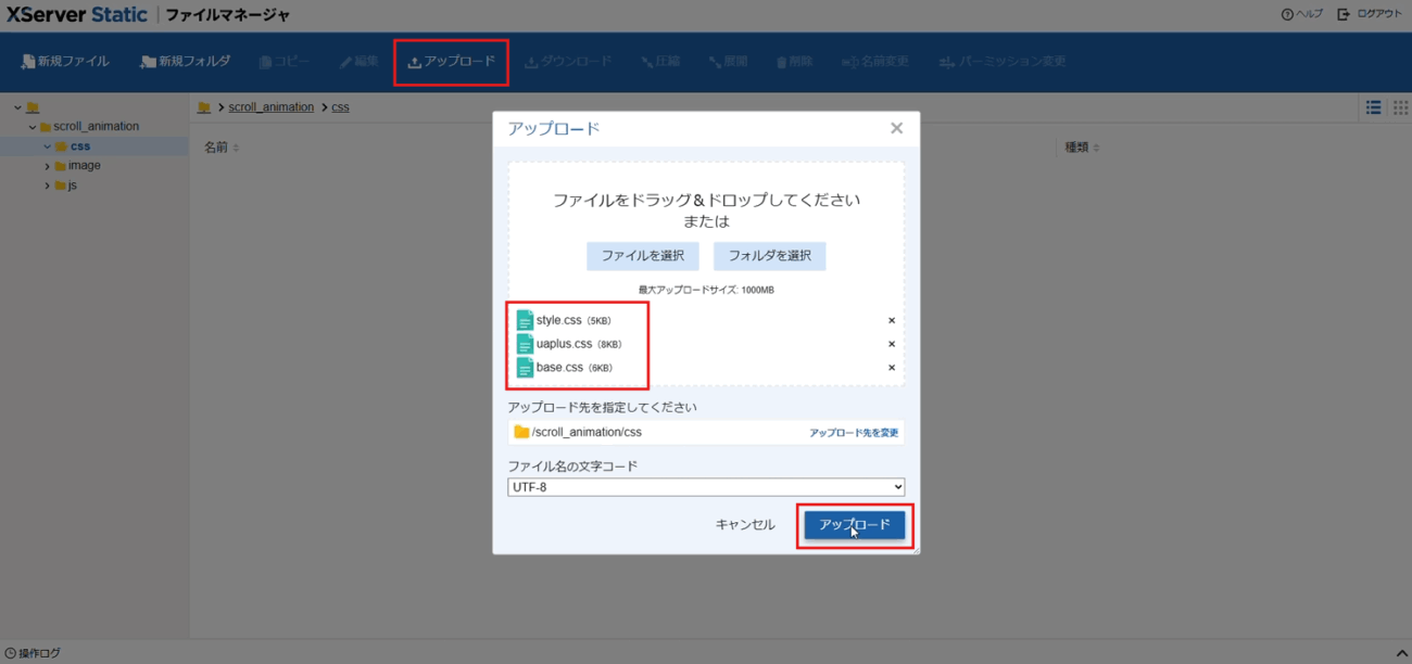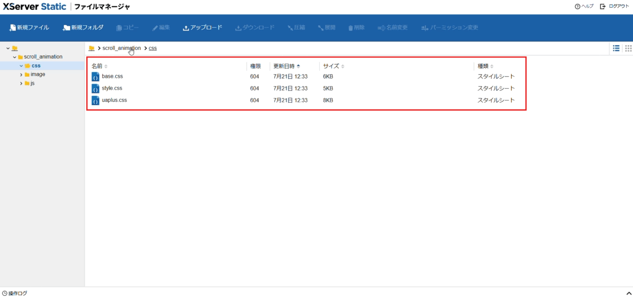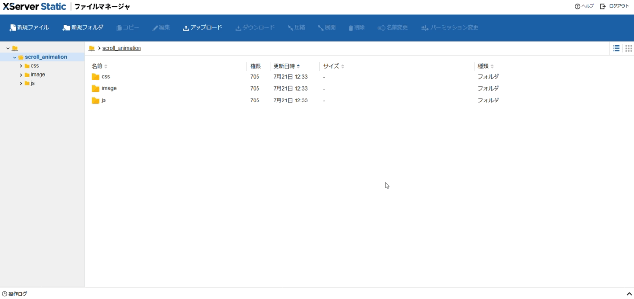 この例では、https://webstudy.static.jp/scroll_animation/ へ素材をアップロードします。