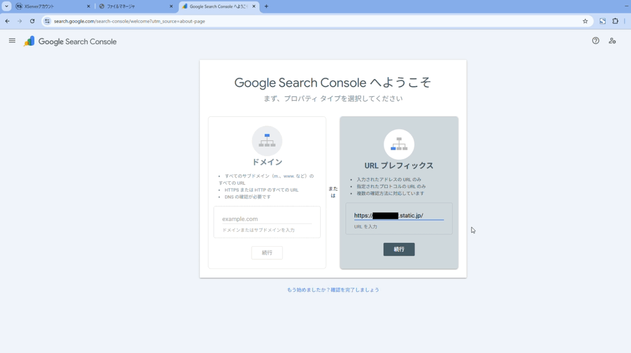 右側「URLプレフィックス」にサイトのURL(トップページのある位置)を入力し、「続行」します。