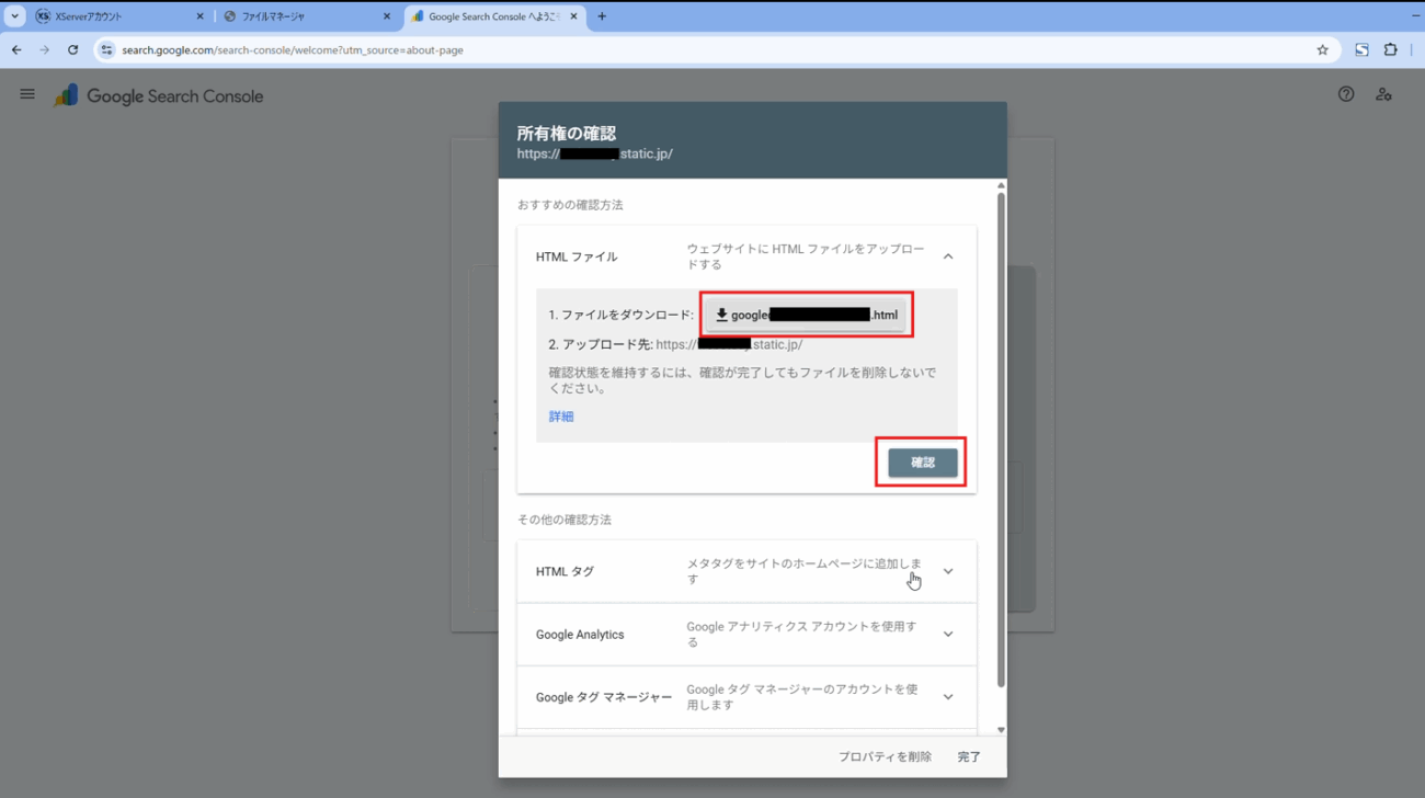 所有権の確認を行います。ファイルをダウンロードするボタン(ファイル名が入っている箇所)をクリックして確認用のhtmlをダウンロードします。