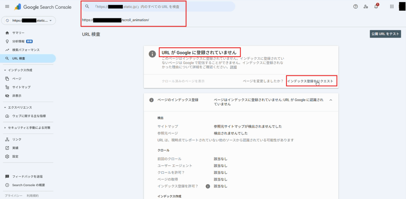 「URLがGoogleに登録されていません」と出るので、「インデックス登録をリクエスト」をクリックします。