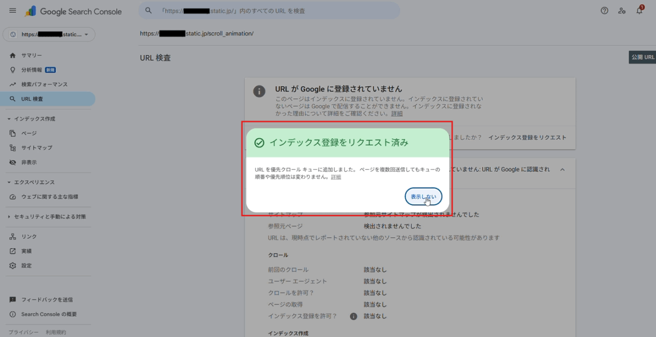 「インデックス登録をリクエスト済み」と表示されたら、このページは完了です。