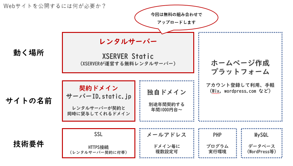 Webページを外部に公開するには、「動く場所=サーバー」「サイトの名前=ドメイン」「技術要件=SSLなど」がそろっている必要があります。