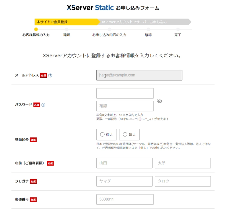 新規アカウントのお申込みフォームに入力する