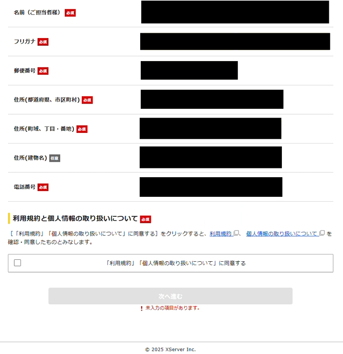 入力したアカウント情報が表示されるので、「この内容で登録しサーバー申し込みへ進む」をクリックします。