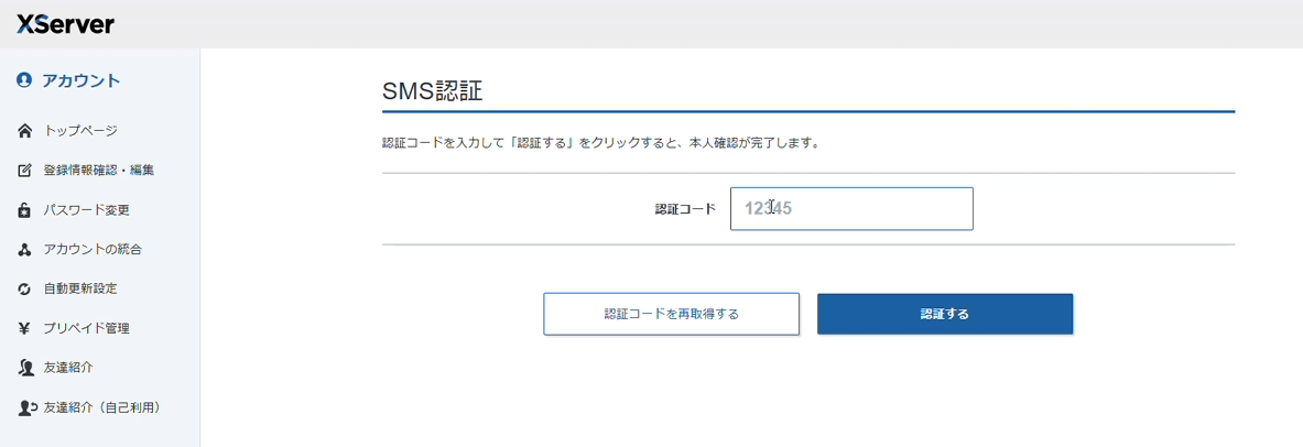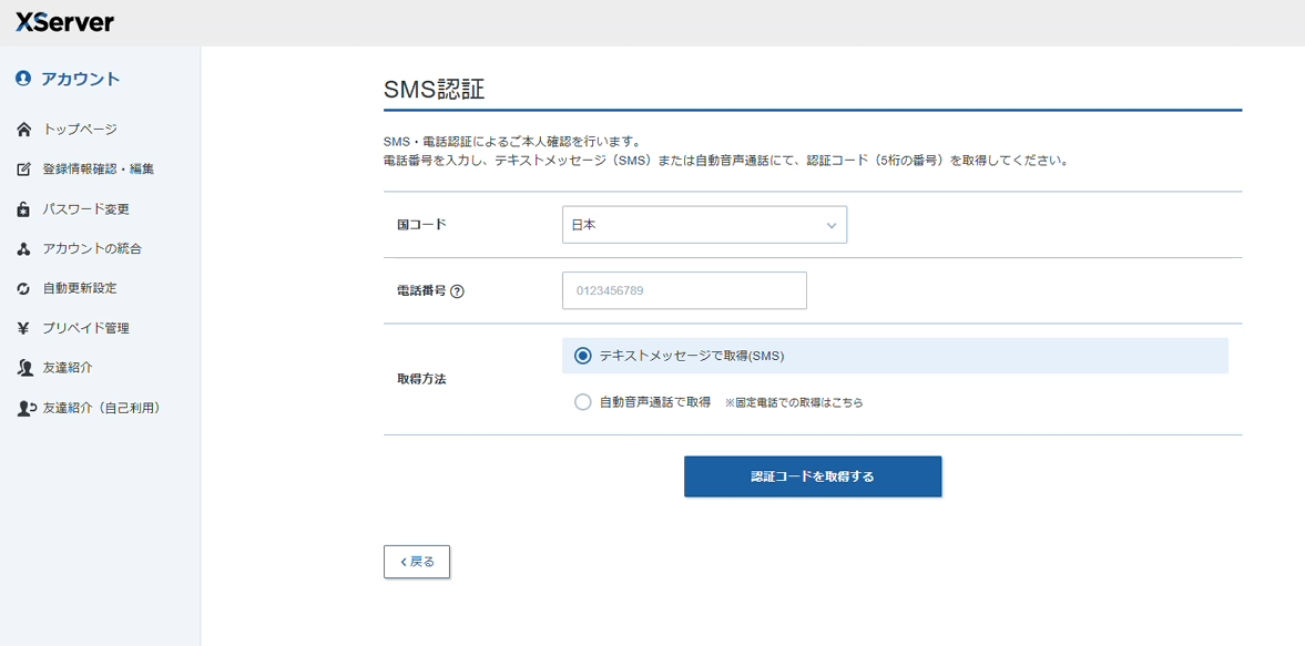 電話番号による本人認証を行います。この例では、SMS認証で進めています。