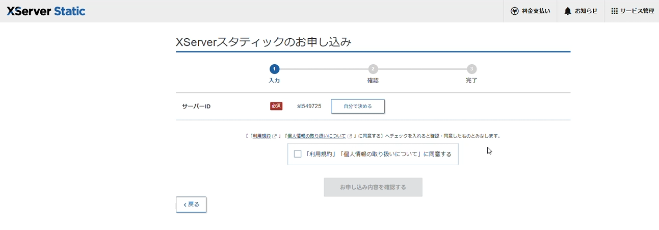 XSERVERへのアカウント登録を行い、次にXSERVER Staticを申し込みます。